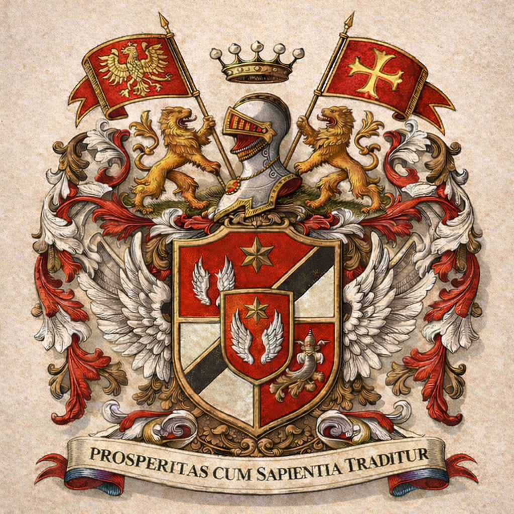 The heraldic symbols of the House reflect this identity with precision. The lions and crown signify authority, vigilance, and rightful standing. The knight’s helm embodies readiness—an enduring commitment to protect and to lead. The silver wings speak to elevation, vision, and guardianship, while the six-pointed star represents guidance and higher purpose.